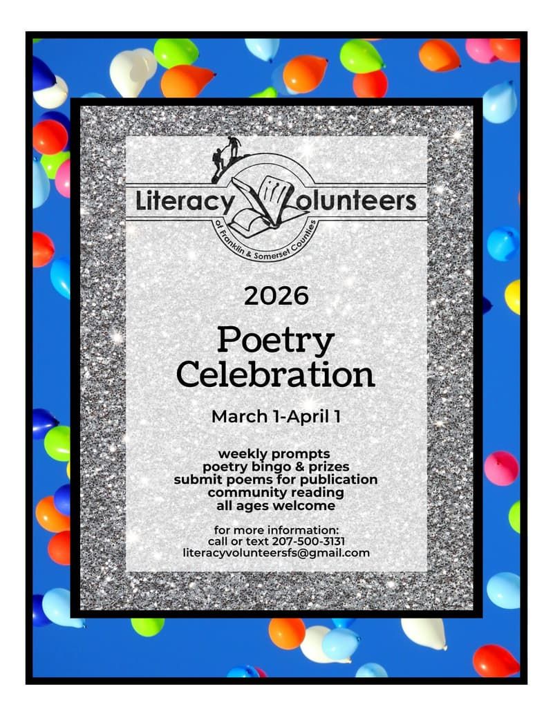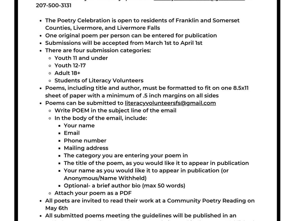 The Poetry Celebration is open to residents of Franklin and Somerset Counties, Livermore, and Livermore Falls. All submissions will be published in an anthology. Published poets will be honored at a Community Poetry Reading on May 6th.