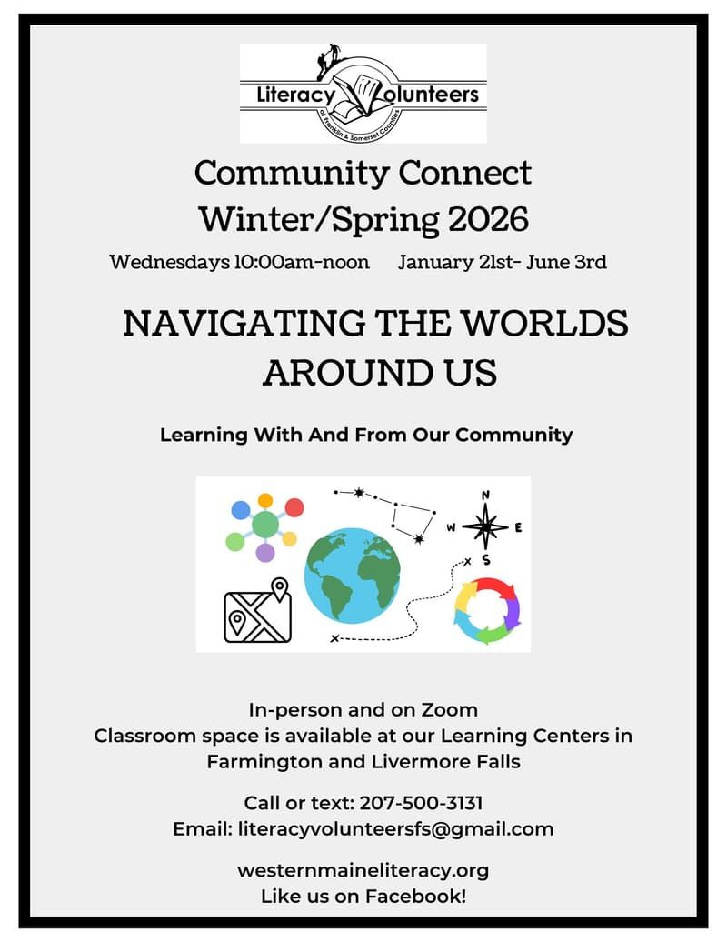 Weekly classes include writing workshops, book discussions, and presentations by local organizations. Collaborators include The Maine Humanities Council, Mt. Blue TV, The Daily Bulldog, Maine State Museum, Healthy Community Coalition, United Way of the Tri-Valley Area, League of Women Voters, New Ventures Maine, and The Maine Cash Coalition.